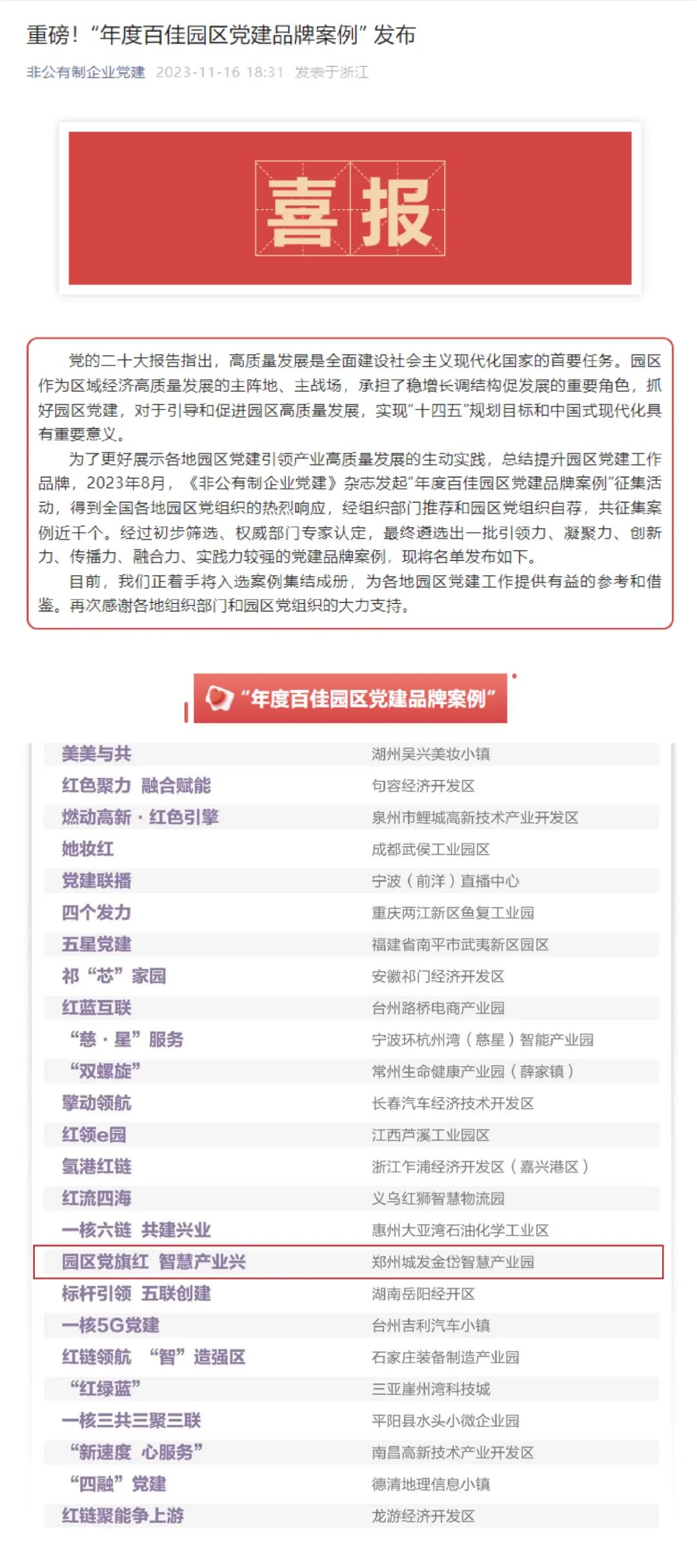 11月16日,由《非公有制企業(yè)黨建》雜志發(fā)起的“年度百佳園區(qū)黨建品牌案例”征集活動(dòng)遴選結(jié)果揭曉。鄭州城發(fā)集團(tuán)“園區(qū)黨旗紅 智慧產(chǎn)業(yè)興”基層黨建“書記項(xiàng)目”從近千個(gè)入圍案例中脫穎而出,成功入選“年度百佳園區(qū)黨建品牌案例”。